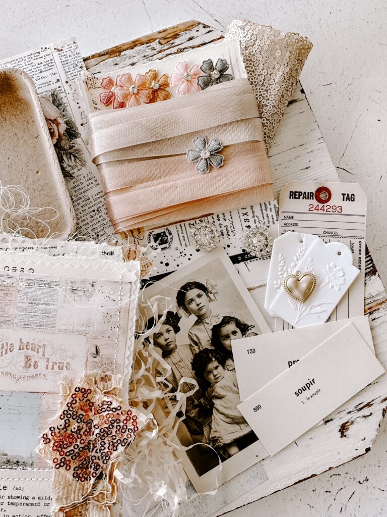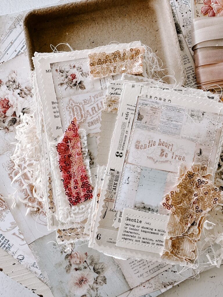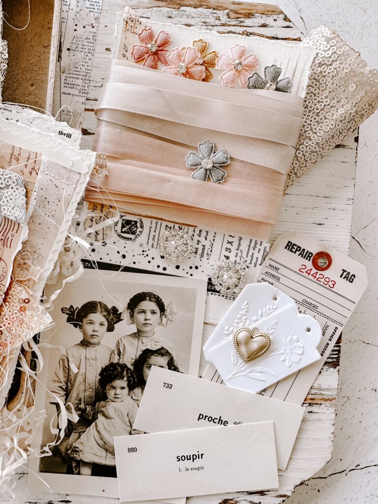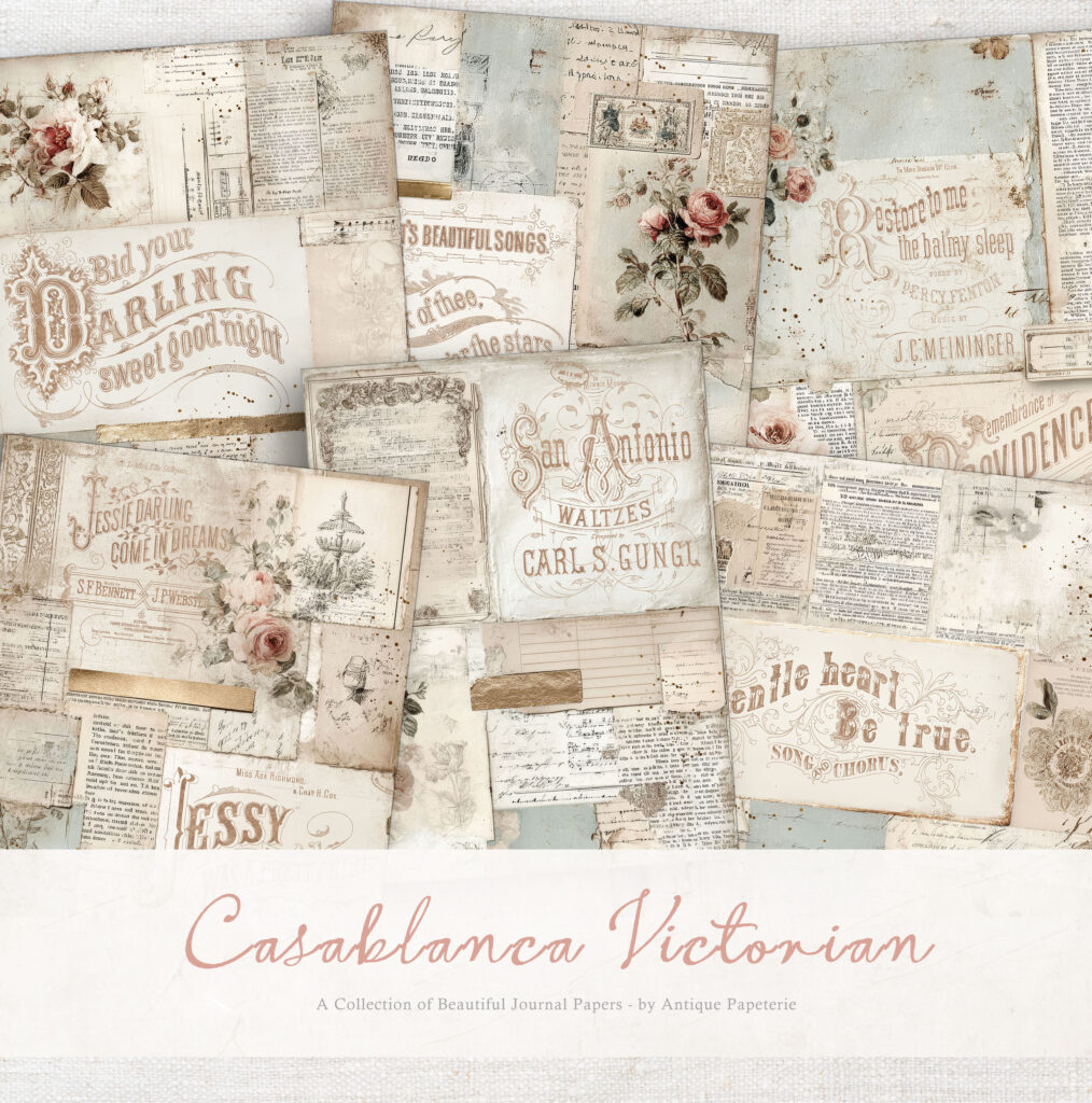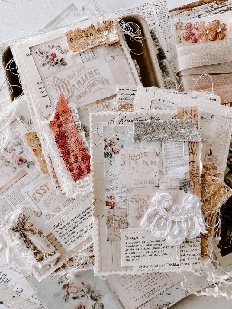 A beautiful “Maker’s Kit” – in our collection titled “Casablanca Victorian” – We print and curate the most beautiful pieces all in one collection. You get 8 printed edge-to-edge borderless papers, set of 8 gorgeous altered stitched 4×6 cards with mini images of the collection, you’ll have a bag of ephemera, a bag of ribbons and bits, a bag of embellishments like German glass glitter, buttons, rhinestones, small bits, and more. Each curated collection you purchase from me, comes with an additional free surprise gift! All packaged in cellophane bags, and shipped in a sturdy cardboard mailer.